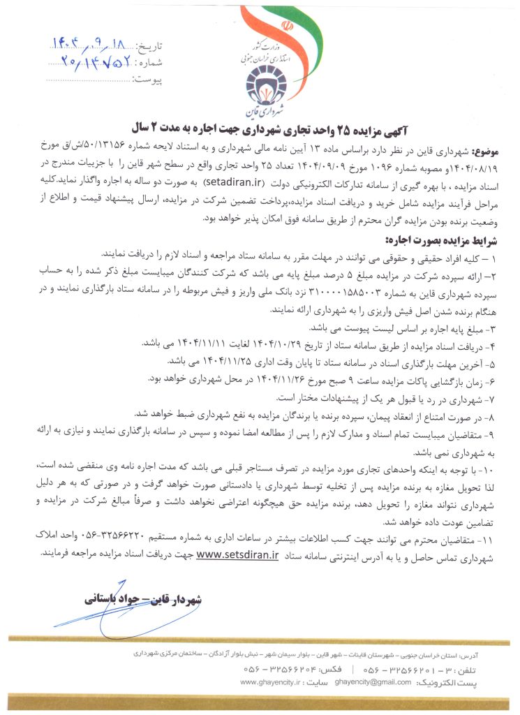 آگهی مزایده 25 واحد تجاری شهرداری جهت اجاره به مدت 2 سال