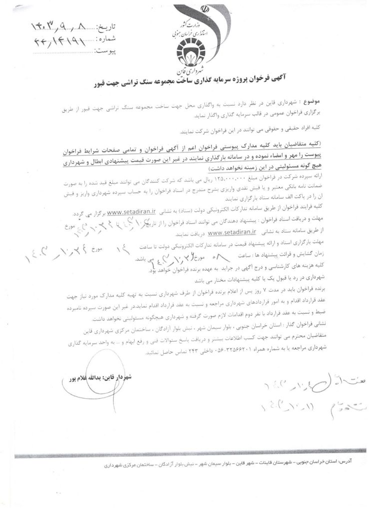 آگهی فرخوان پروژه سرمایه گذاری ساخت مجموعه سنگ تراشی جهت قبور