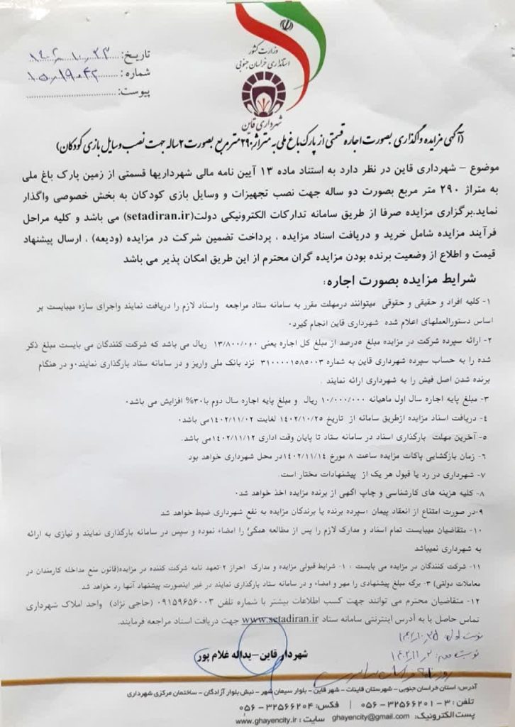 آگهی مزایده واگذاری بصورت اجاره قسمتی از پارک باغ ملی به متراژ 290 متر مربع بصورت 2 ساله جهت نصب وسایل بازی کودکان