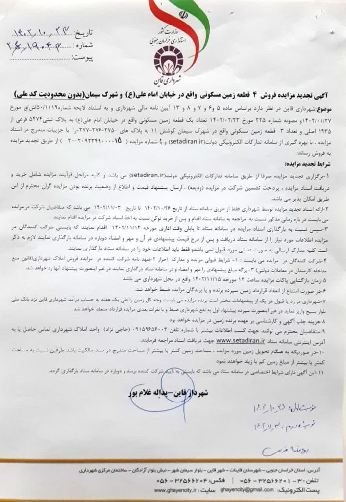 آگهی تجدید مزایده فروش 4 قطعه زمین مسکونی واقع در خیابان امام علی(ع) و شهرک سیمان(بدون محدودیت کد ملی)
