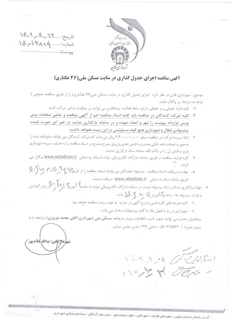 آگهی مناقصه اجرای جدول گذاری در سایت مسکن ملی(36 هکتاری)