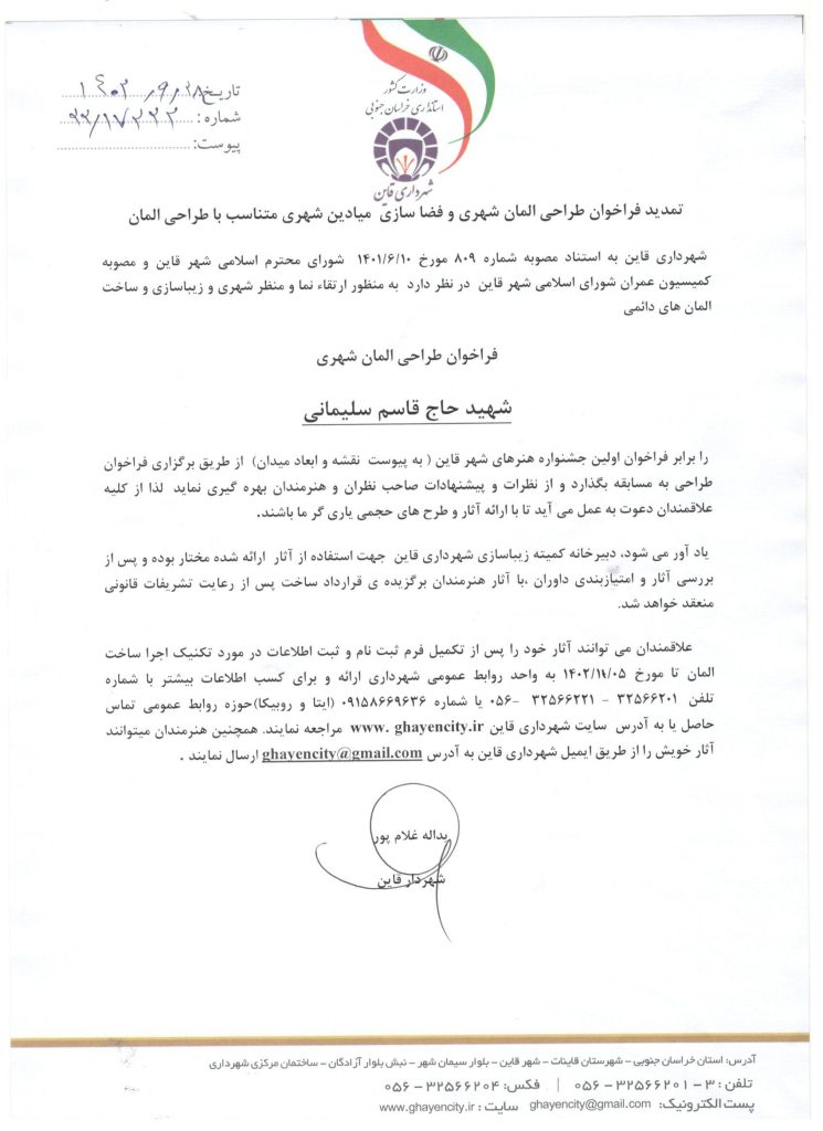 تمدید فراخوان طراحی المان شهری و فضای سازی میدان شهید حاج قاسم سلیمانی