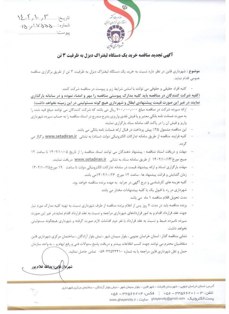 آگهی تجدید مناقصه خرید یک دستگاه لیفتراک دیزل به ظرفیت 3 تن